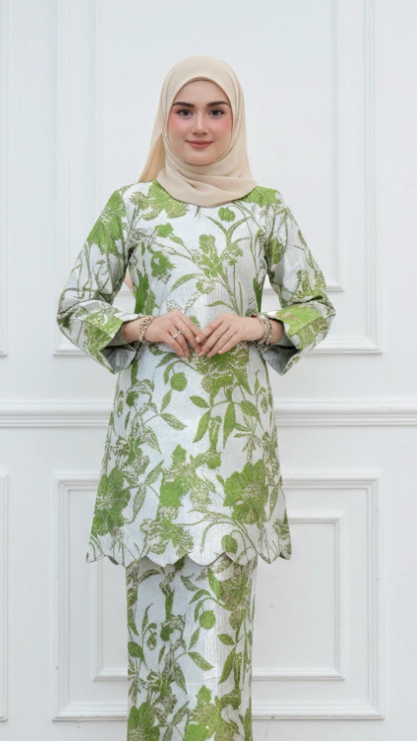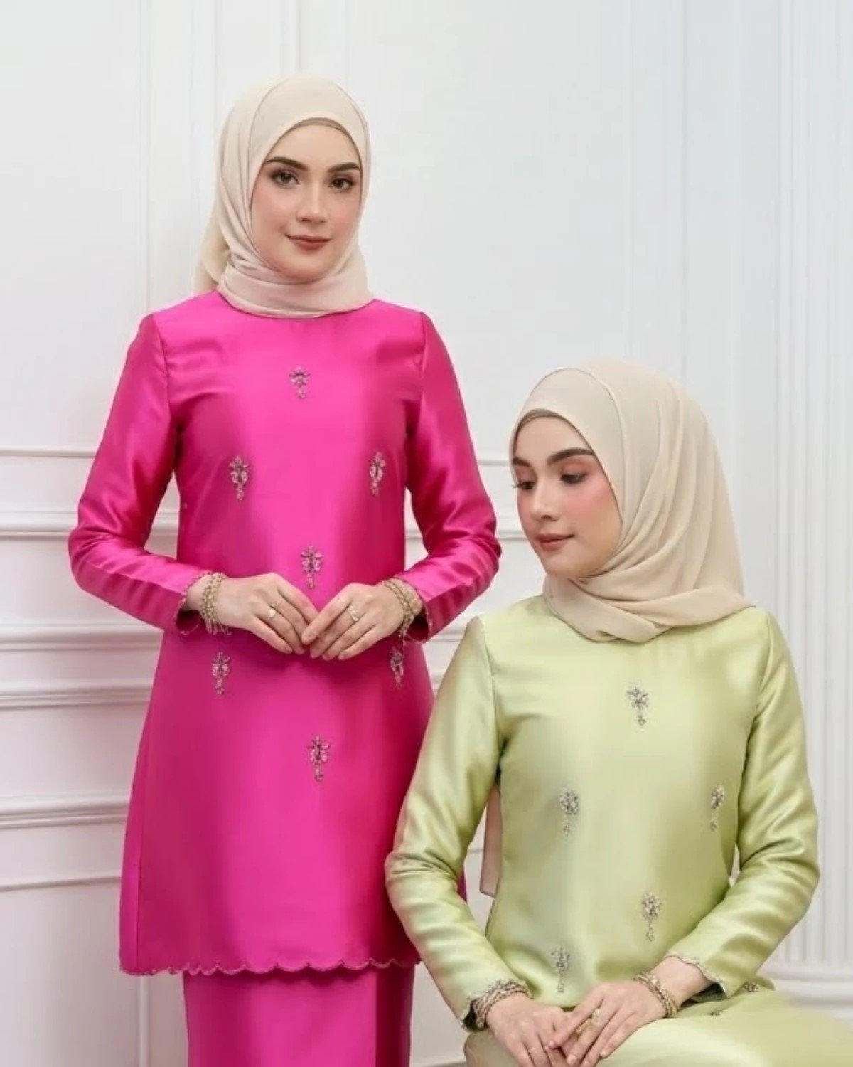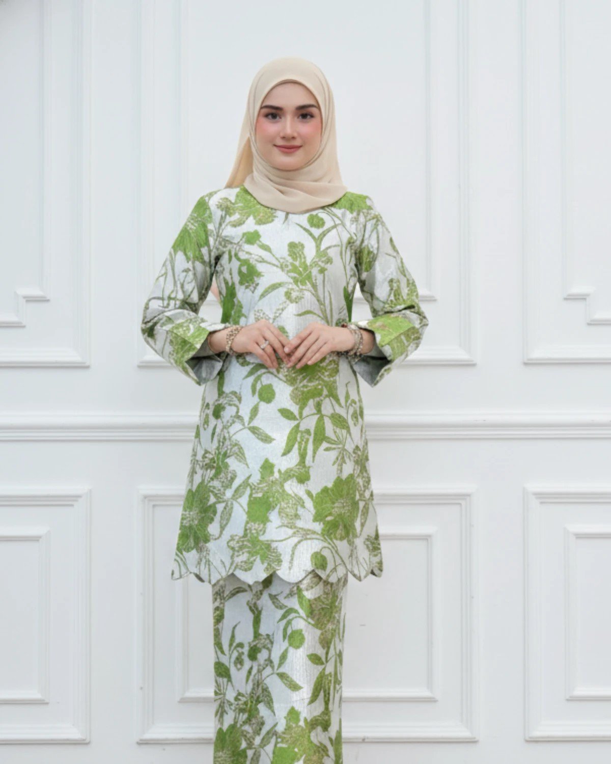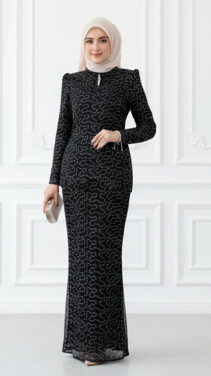Featuring hand-sewn beading embroidery meticulously colour-matched to the fabric, Sabrina Kurung reflects attention to detail and artisanal quality. The A-cut design paired with a front pleated skirt (skirt lipat depan) creates a flattering, elongated look while maintaining comfort and ease of movement.