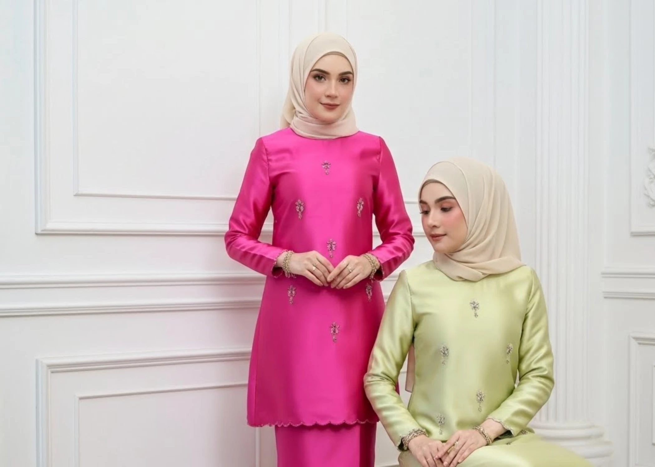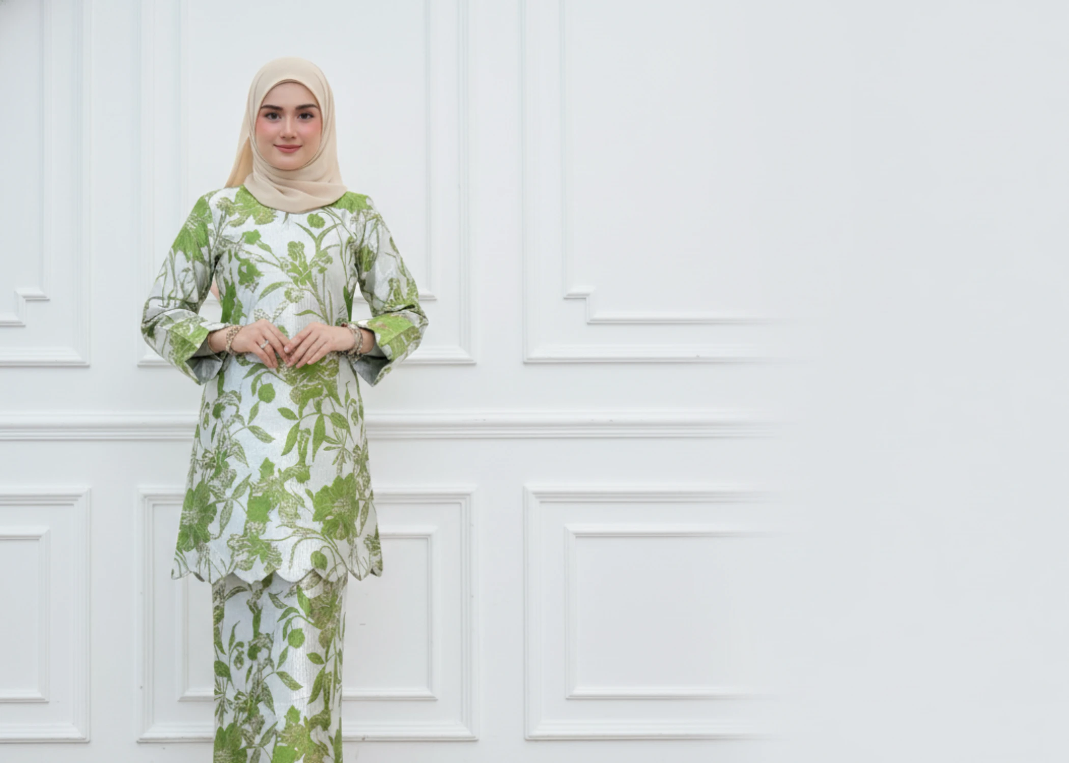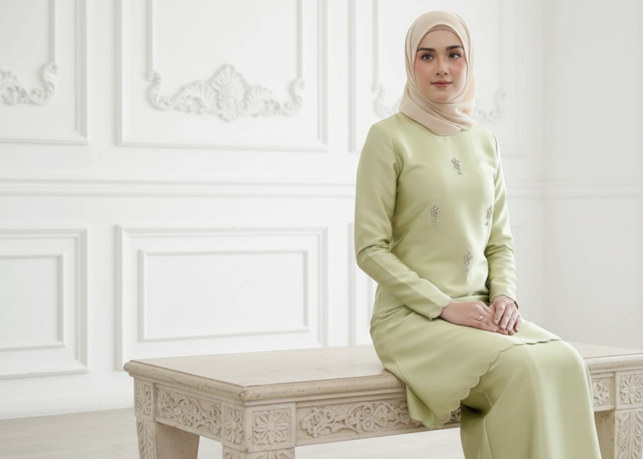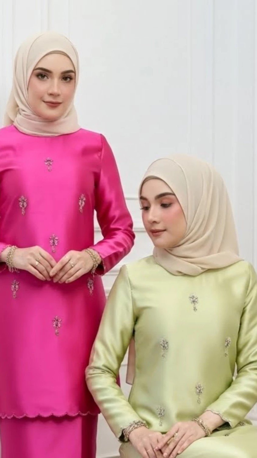 Featuring hand-sewn beading embroidery meticulously colour-matched to the fabric, Sabrina Kurung reflects attention to detail and artisanal quality. The A-cut design paired with a front pleated skirt (skirt lipat depan) creates a flattering, elongated look while maintaining comfort and ease of movement.